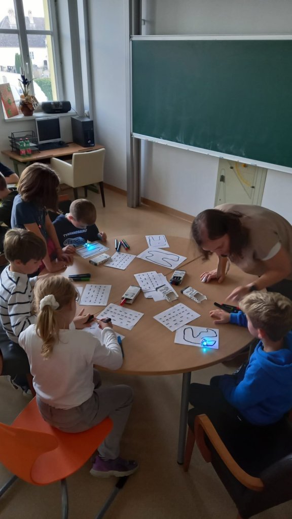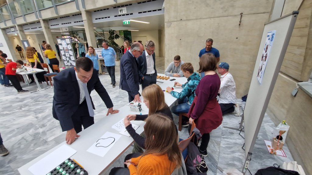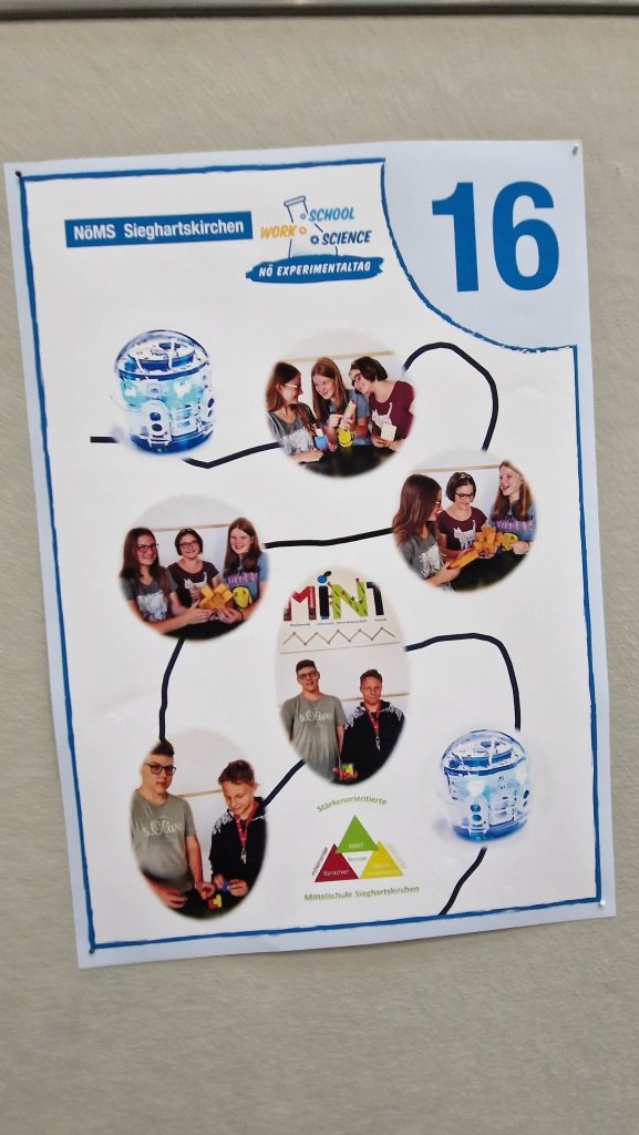 Unter Anderem auch vertreten: die MINT-Mittelschule Sieghartskirchen, mit ausgewählten Schülerinnen und Schülern der 4. Klassen mit naturwissenschaftlichem Schwerpunkt. Sie präsentierten kleine akkubetriebene Roboter, namens Ozobots, welche an der Unterseite mit zwei motorbetriebenen Rädern und fünf Farbsensoren ausgestattet sind. Ebenso mussten knifflige Rätselaufgaben, welche im Unterrichtsfach Technik und Design gefertigt wurden, erfolgreich gelöst.