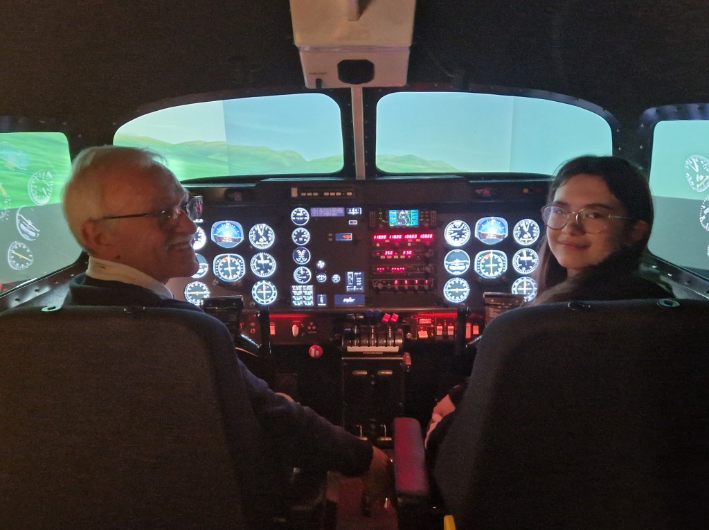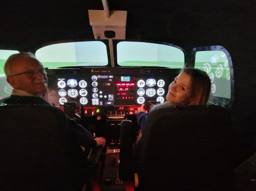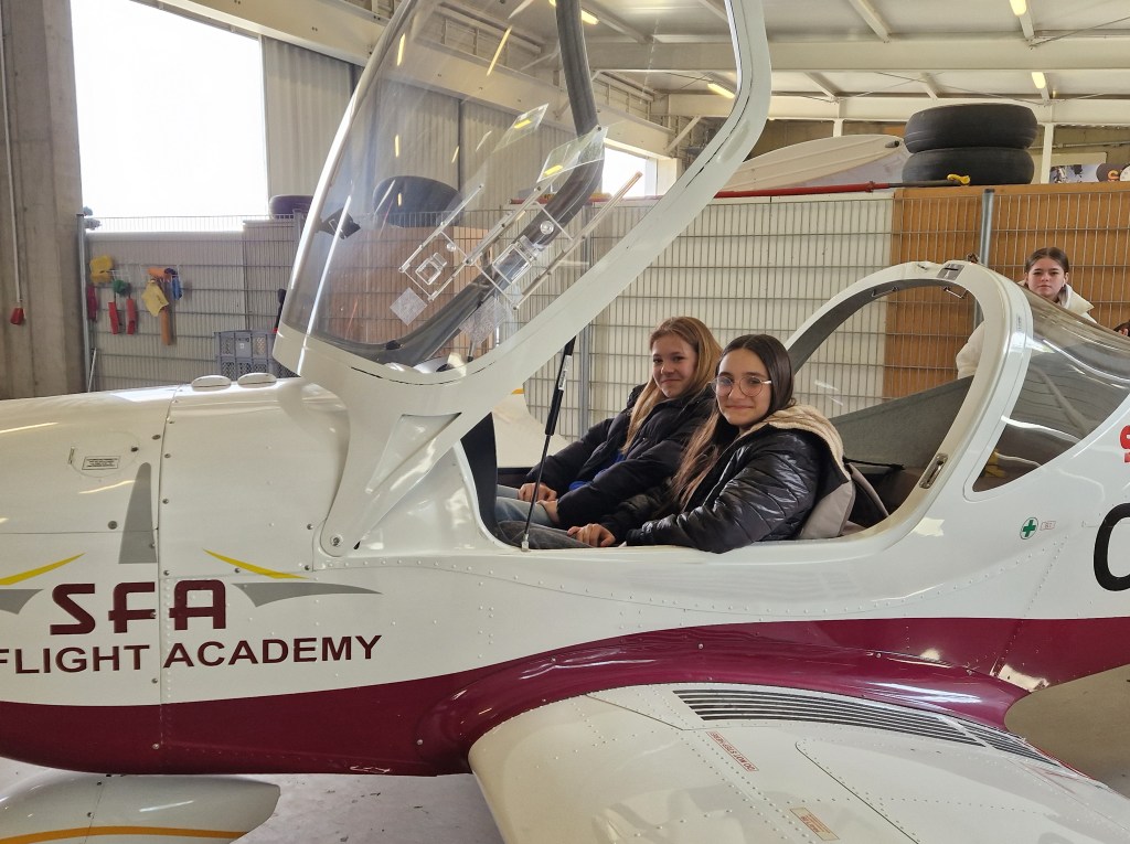 Danach durften die 18 Mädchen im Cockpit eines kleineren Flugzeugs sitzen und sogar verschiedene Hebel und Schalter bedienen. Danach ging es wieder ins Cockpit eines Simulators mit einem Piloten, der die Mädchen beim Fliegen und Landen des Flugzeugs unterstützte.