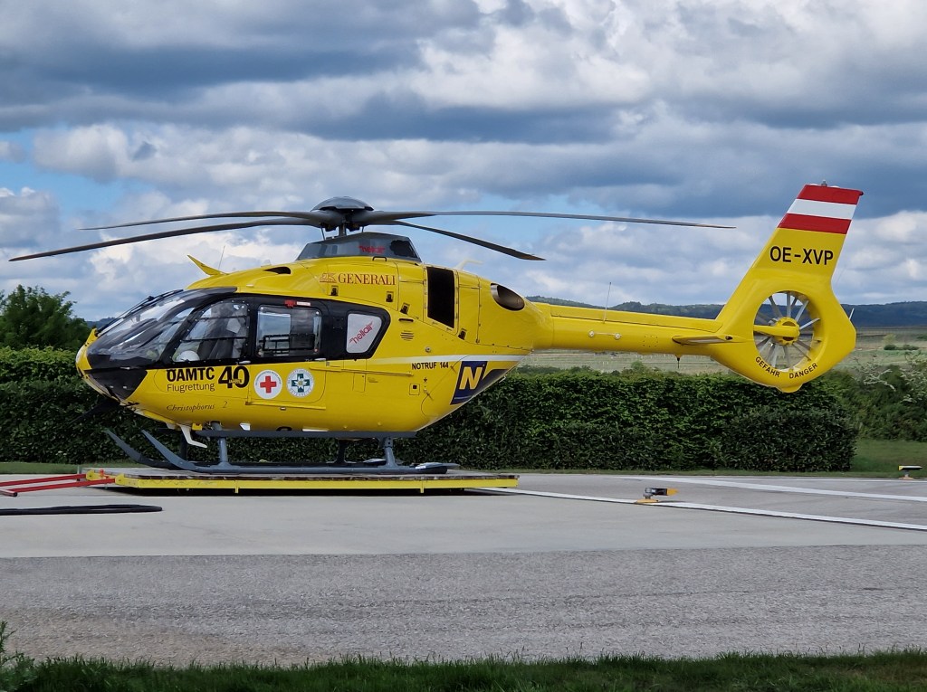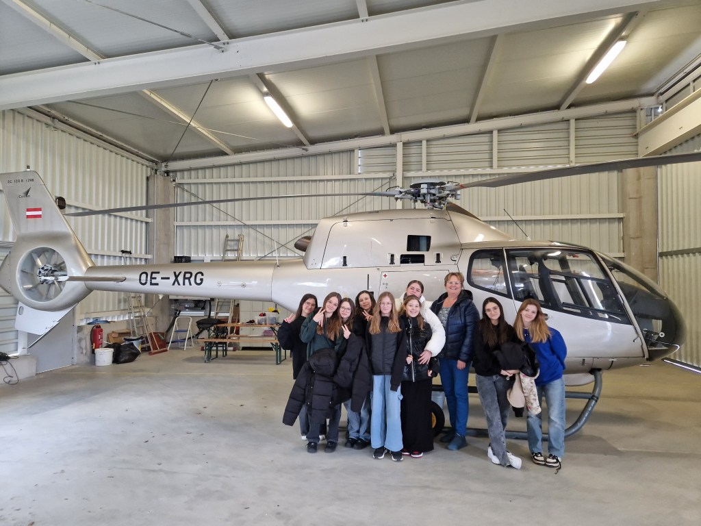 Auch das Außengelände besuchten wir, wo ein Rettungshubschrauber stationiert ist und wir die FlugschülerInnen beim Trainingsflug beobachten konnten.